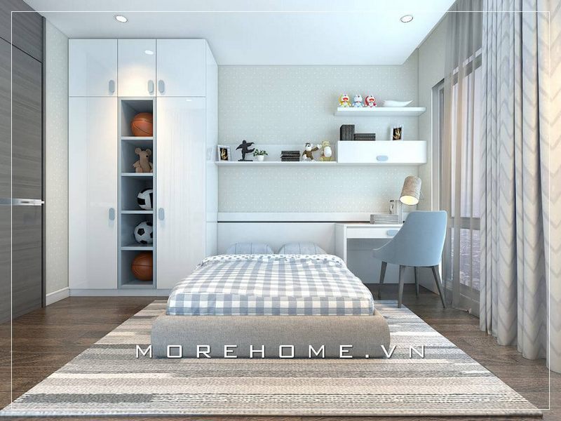 Tủ quần áo gỗ công nghiệp Acrylic được gia chủ lựa chọn bé yêu nhà mình, với gam màu xanh chủ đạo góp phần tô điểm cho căn phòng thêm độc đáo, ấn tượng