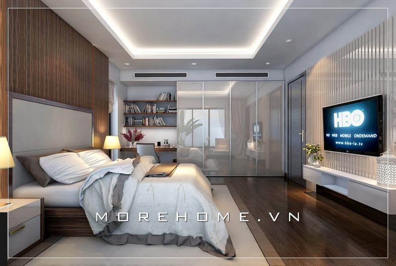 Thiết kế tủ quần áo cánh mở gỗ Acrylic kết hợp giá để sách và bàn làm việc vừa thẩm mỹ vừa tạo sự tiện lợi khi sử dụng
