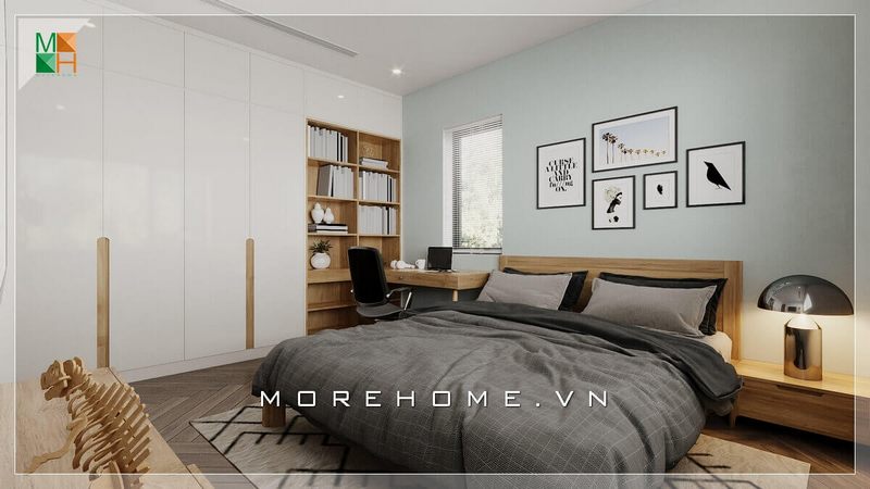Tủ quần áo cánh mở hiện đại tích hợp với bàn học, sử dụng màu sơn trắng phối với màu nâu gỗ công nghiệp Acrylic tạo nên vẻ đẹp ấm áp cho căn phòng