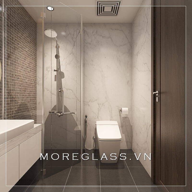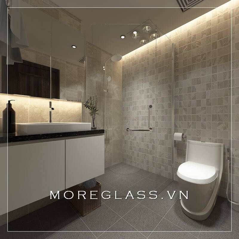 Mẫu thiết kế nhà vệ sinh đẹp, nhỏ gọn được sắp xếp hợp lí với kệ tủ lavabo và phòng tắm kính đẹp trong góc nhỏ đem lại vẻ đẹp tinh tế, sang trọng và cuốn hút.
