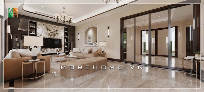 Việc thi công nội thất theo phong cách cổ điển cho phòng khách của biệt thự đã được thực hiện.